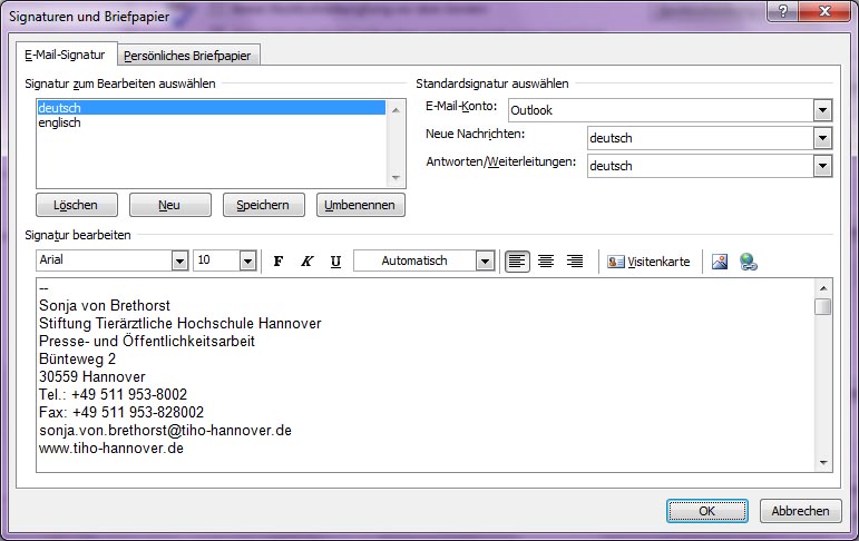 Es ist aber wichtig, immer eine E-Mail-Signatur zu verwenden und nicht bei, zum Beispiel internen Mails, darauf zu verzichten. Auch innerhalb der TiHo erleichtert es die Abläufe, wenn die Kontaktdaten des Absenders in der Signatur angegeben werden. Zu einem seriösen Auftreten gehört es zudem, auf Emoticons, Animationen, „lustige“ Sprüche, selbst gebastelte Logos etc. zu verzichten. Auch Disclaimer oder Warnhinweise sind überflüssig und gehören nicht in eine E-Mail-Signatur. Das TiHo-Logo sollte ebenfalls nicht in die Signatur eingebunden werden, weil das in der Summe zu einem stark erhöhten Datenaufkommen führt. Bitte verwenden Sie zudem für Ihre deutschsprachigen E-Mails eine deutsche Signatur und für Ihre internationale Korrespondenz eine englischsprachige E-Mail-Signatur. Eine Zeile sollte nicht mehr als 80 Zeichen enthalten.