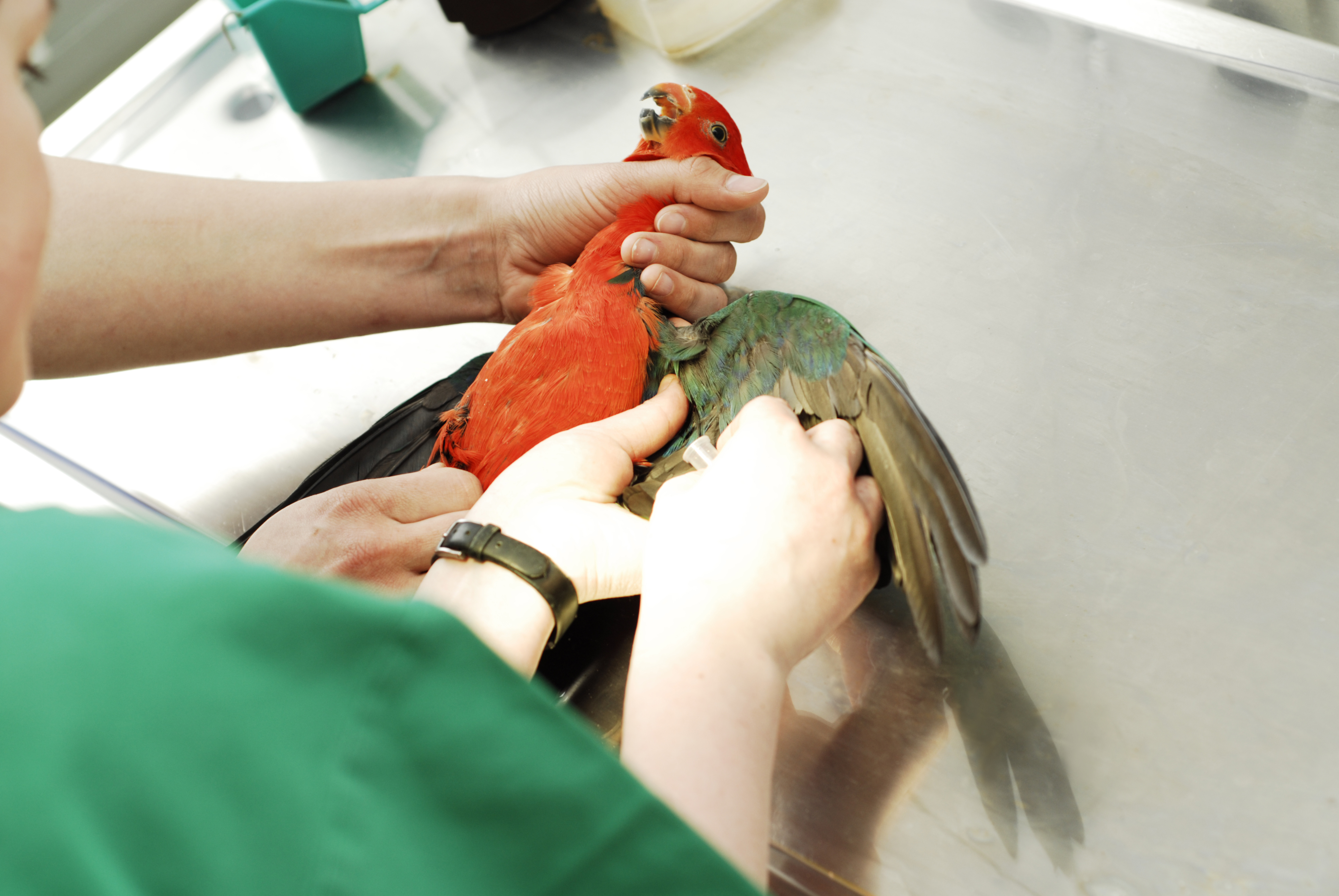 Blutprobenentnahme bei einem Vogel in der Klinik für Heimtiere, Reptilien und Vögel.