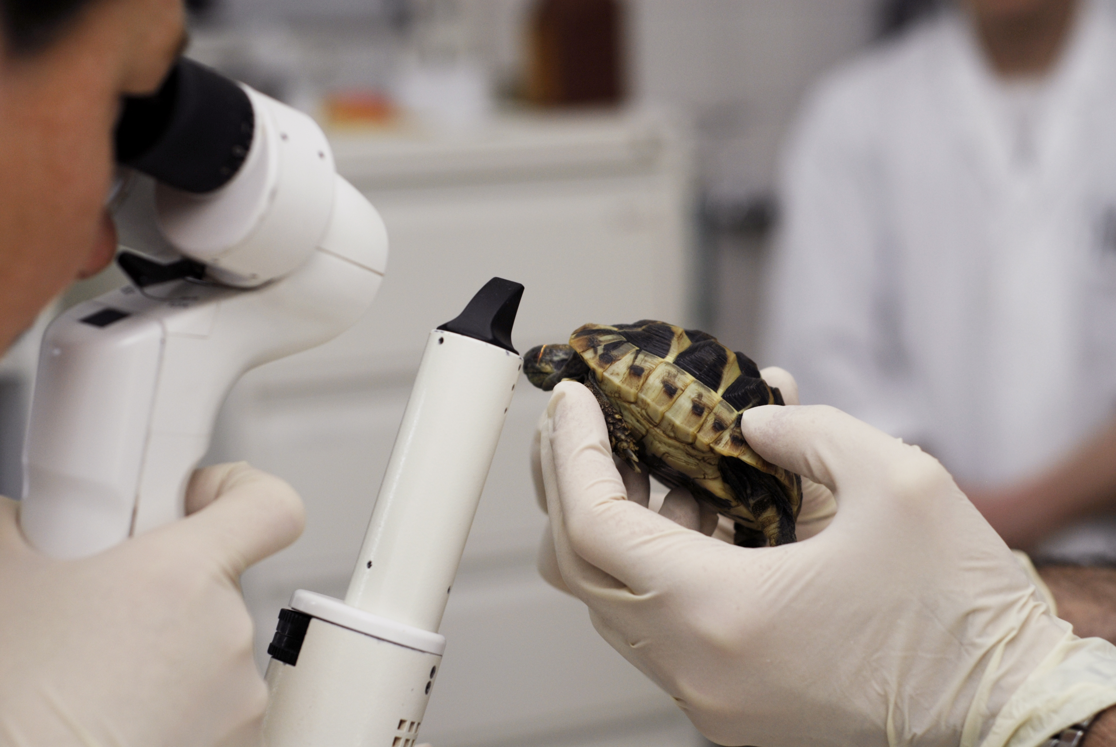 Untersuchung einer Schildkröte in der Klinik für Heimtiere, Reptilien und Vögel.