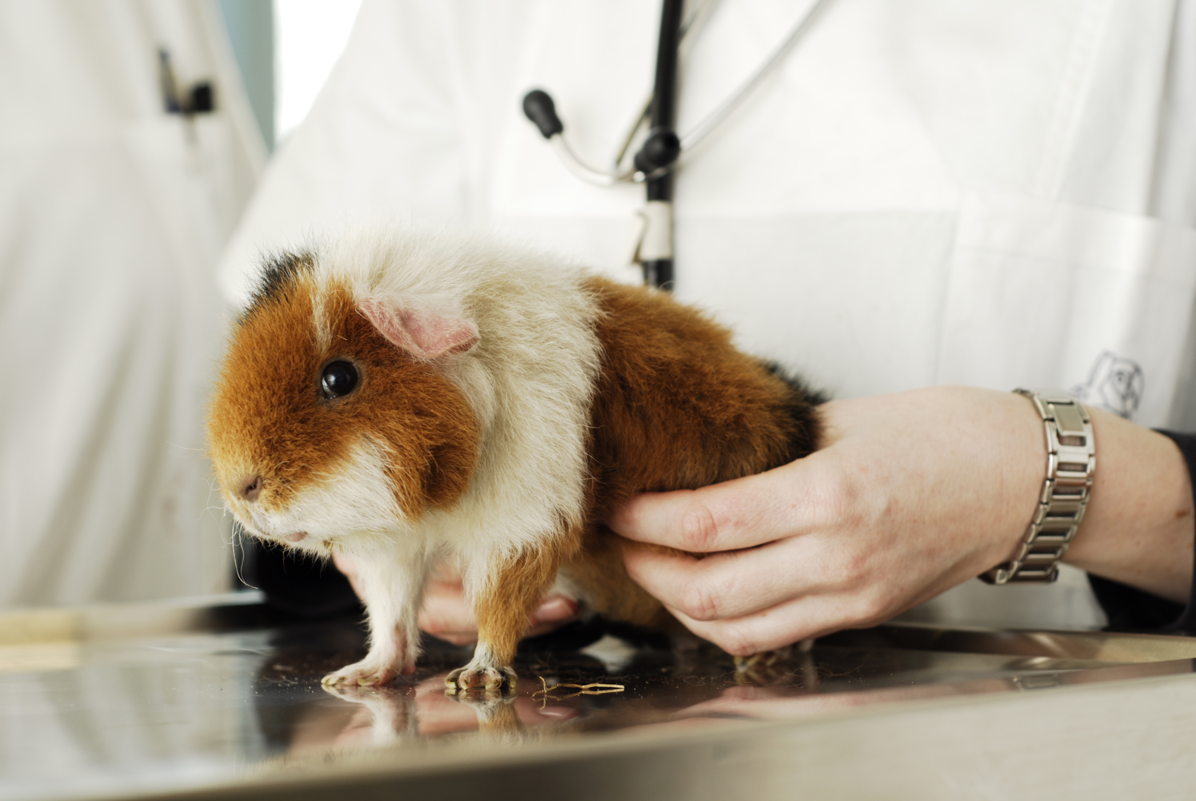 Untersuchung eines Meerschweinchens in der Klinik für Heimtiere, Reptilien und Vögel.