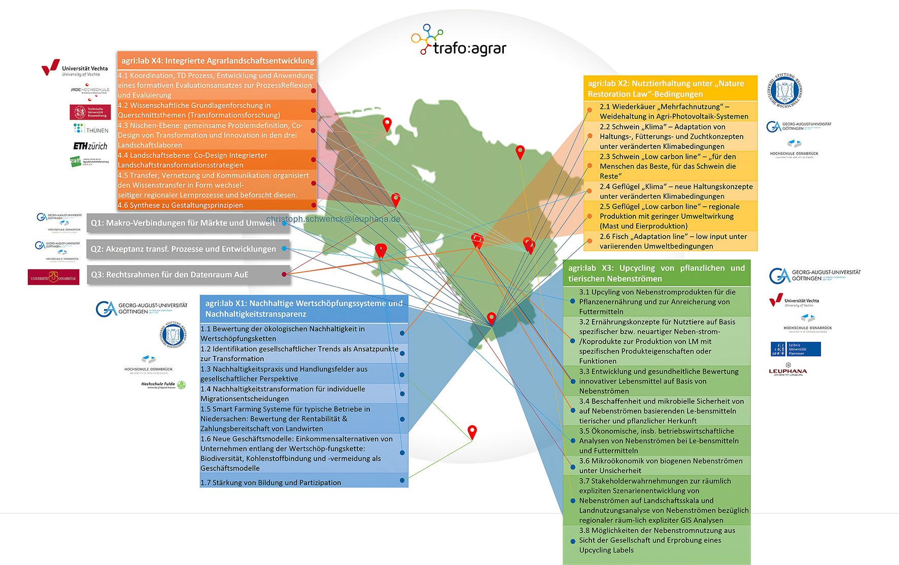 Unter der Koordination der Universität Göttingen und in enger Zusammenarbeit mit dem Netzwerk trafo:agrar werden in vier agri:labs praxisorientierte Lösungen entwickelt und erprobt. Hier entstehen neue Ansätze für nachhaltige Wertschöpfungssysteme, zukunftsweisende Tierhaltung, Stärkung der Kreislaufwirtschaft durch die Nutzung von Nebenströmen sowie der integrierten Agrarlandschaftsentwicklung.
